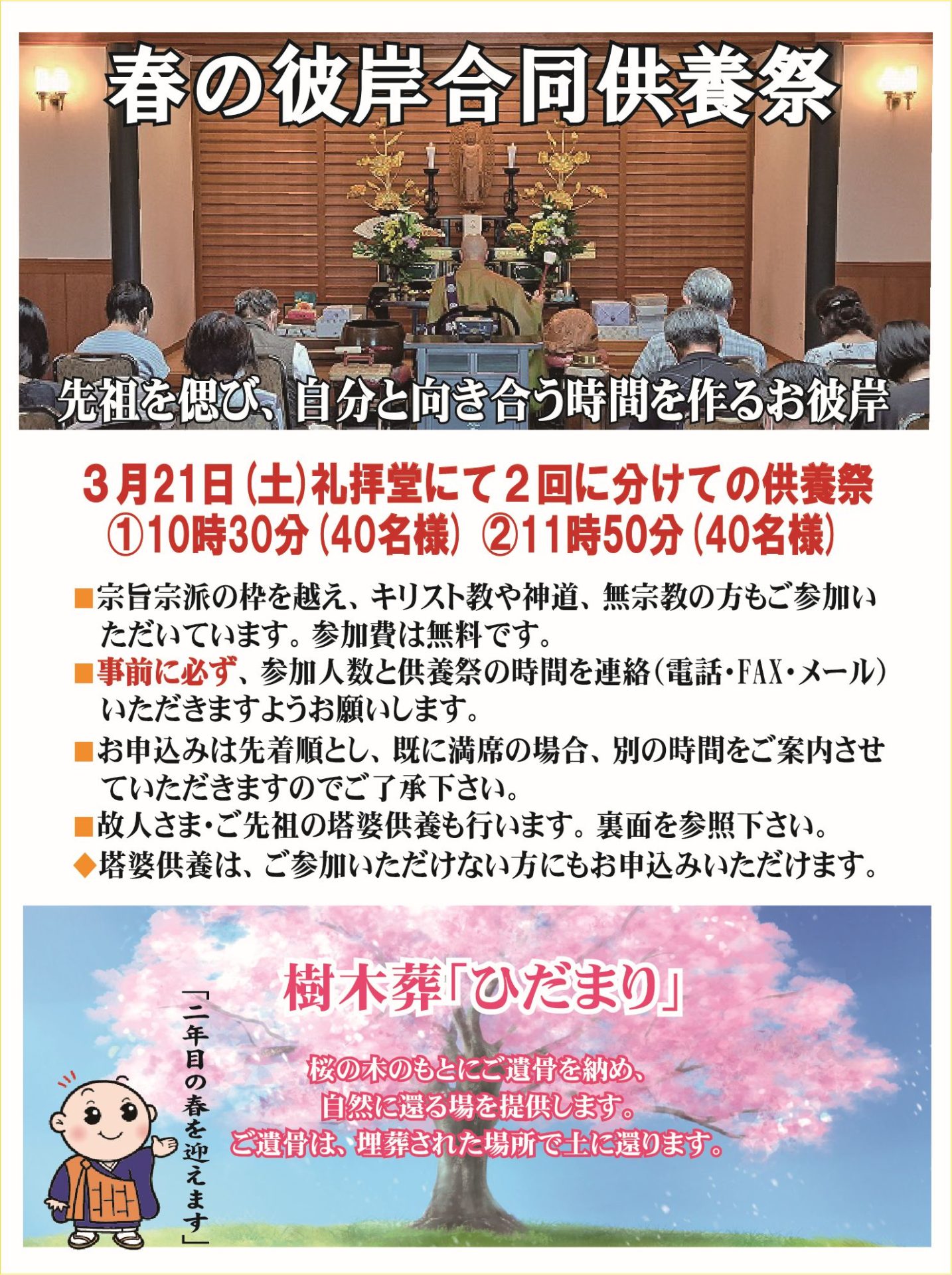 礼拝堂にて、皆さまご参列のもと合同供養祭を春の彼岸・お盆・秋の彼岸の年三回行っています。